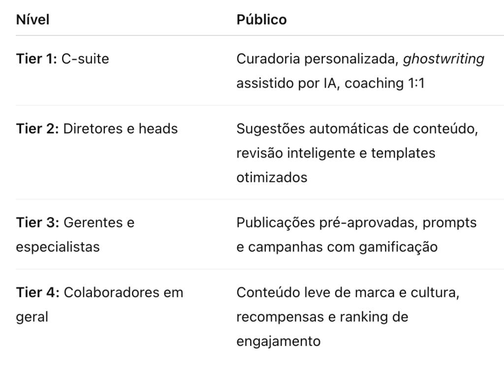 Quando um CEO, CMO ou diretor compartilha suas ideias, o alcance orgânico se multiplica, o engajamento é autêntico e o impacto vai muito além de curtidas: ele gera pipeline, confiança e cultura.